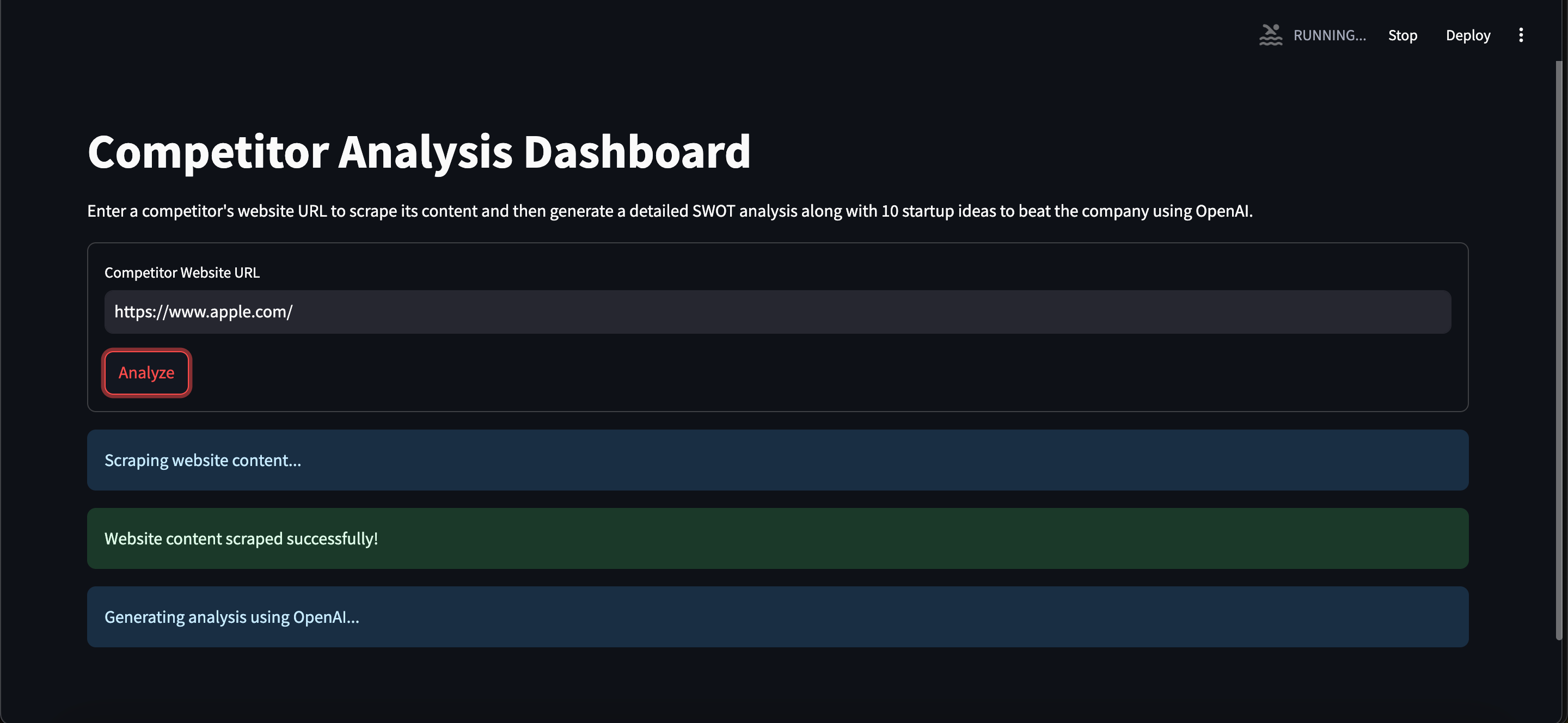 Press “Analyze”. The app will use Firecrawl to crawl the website, and use OpenAI’s API to generate the SWOT and startup ideas.